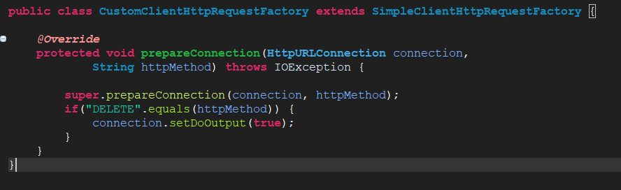 따라서, SimpleClientHttpRequestFactory를 상속시킨 클래스를 하나 만들어서 setDoOutput = ture로 값을 지정하고, DELETE 메서드로 통신이 필요한 경우 분기문 처리해서 해당 클래스로 통신을 하게 하면 된다.