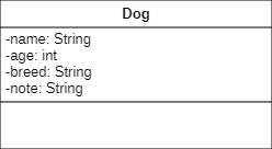 가령 아래와 같은 필드를 가지고 있는 Dog 객체를 'note' 필드는 빈값으로 둔 채 생성자 패턴으로 인스턴스화 시키려고 했을 때, 빈 값이라도 넣어주거나 'note'를 파라미터로 가지지 않는 새로운 생성자를 오버로딩 해야한다.